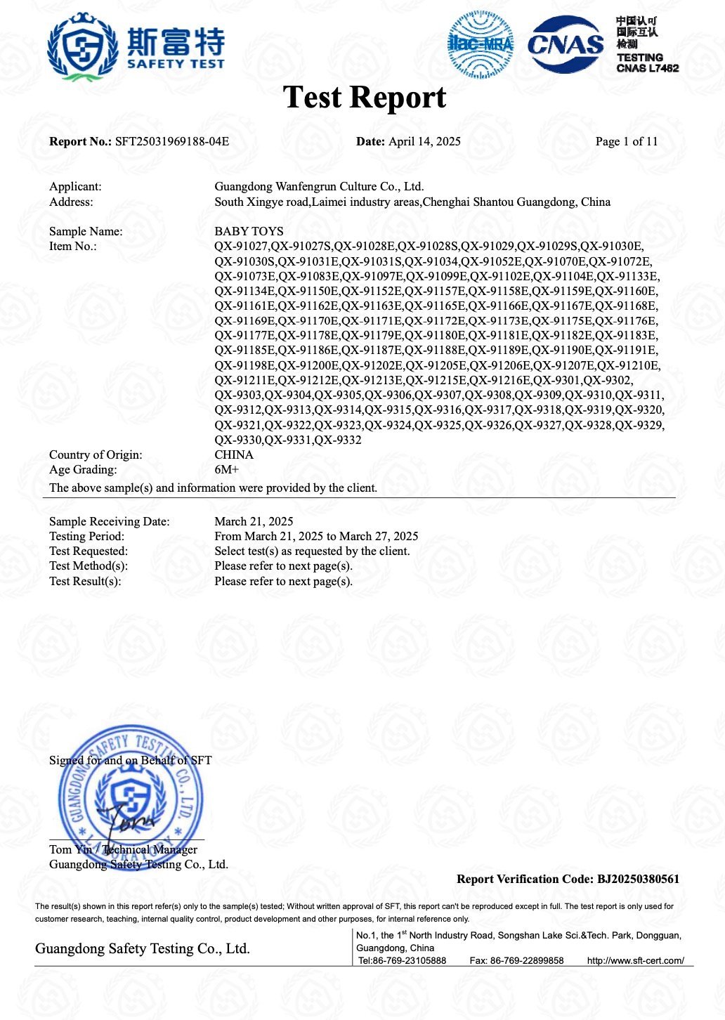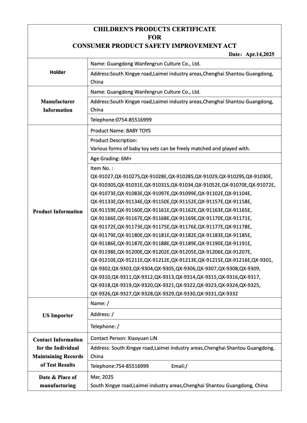 HXJ is proud to hold complete certifications. These credentials reflect our commitment to providing customers with reliable, eco-friendly, and high-performance toy solutions that meet global regulatory requirements.